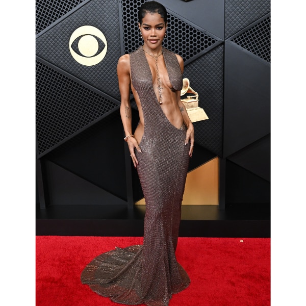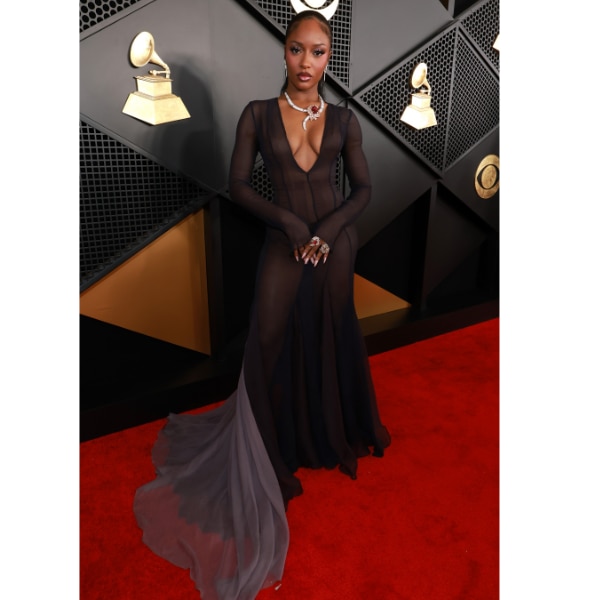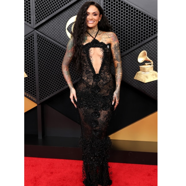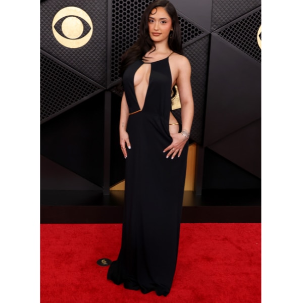 Kehlani leaned into controlled sensuality in a cut-out gown by Valerian Sahiti that felt perfectly aligned with the Grammys’ anything-goes dress code. The midriff-baring silhouette struck a balance between elegance and edge, while the details, right down to her “Ice Out” pin, added a playful, personal touch. It was understated confidence with just enough bite.