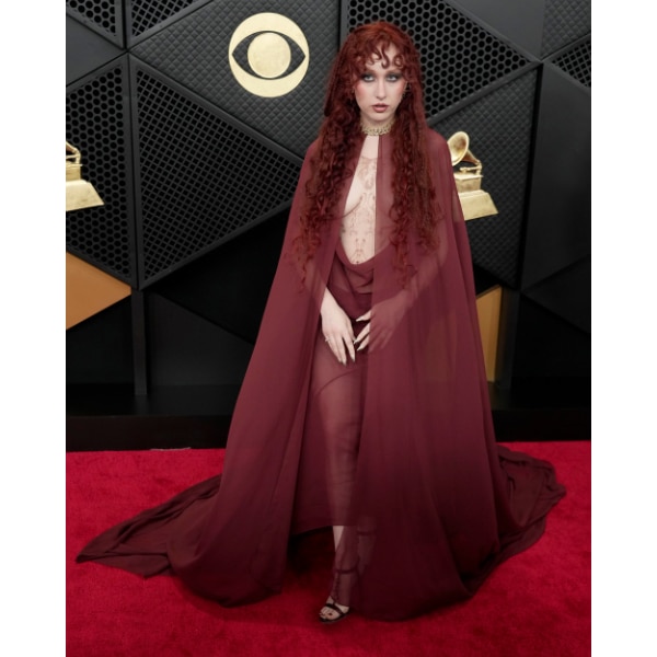 Chappell Roan ensured no one would forget her arrival. Dressed (quite a stretch!) in a burgundy chiffon Mugler creation by Miguel Castro Freitas, her red carpet look was sheer, fluid, and deliberately provocative. With the cape removed, the dress revealed itself to be entirely backless and frontless, leaving her chest exposed and the nipple-baring detail unmistakably intentional. It was a theatrical, high-fashion moment so bold it necessitated a wardrobe change before she took the stage.