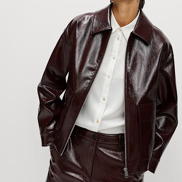 This jacket has a glossy, lacquered finish that gives it a clean, sharp edge. It’s structured enough to elevate an outfit but still comfortable and wearable. Style it with an all-black base or a fitted turtleneck to get that sleek, night-out winter energy.