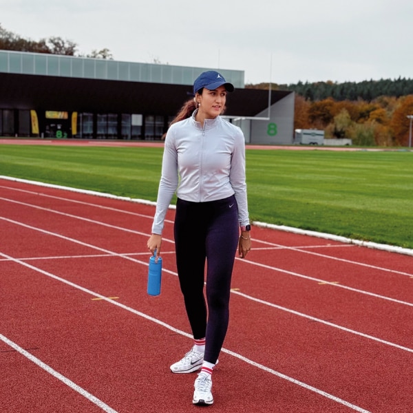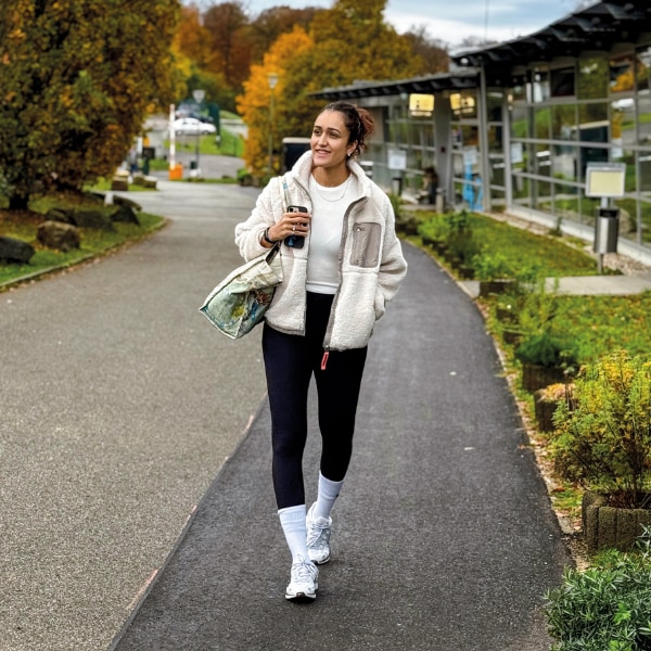 Exhibit A—the 30-year-old’s Instagram feed, which is unlike that of many other Indian athletes. Interspersed with professionally shot photos of her playing on international stages, there are glimpses into her fashionable personal life. Olympic-themed nail art, Celine sweaters, and a Miss Dior cropped tee sit beside athleisure from Puma, Adidas, and Nike. When asked, Batra isn’t shy to admit: “My priority is always the sport, but I love to style myself. Because I’m tall, I usually go for a clean, minimal yet expressive look, outfits that are simple but still say something about me.” To brave the colder temperature of London, where she was the night before the interview, she relied on her Moncler jacket. “Oh, and I love Goyard bags! And, not to forget, Miu Miu shoes.”