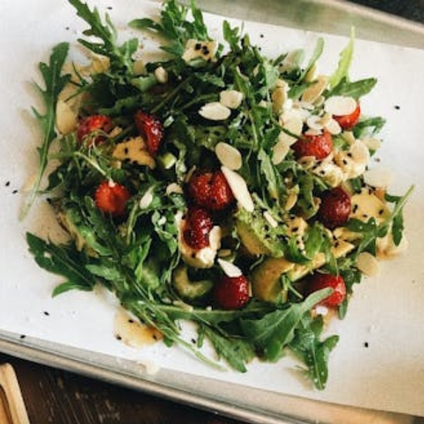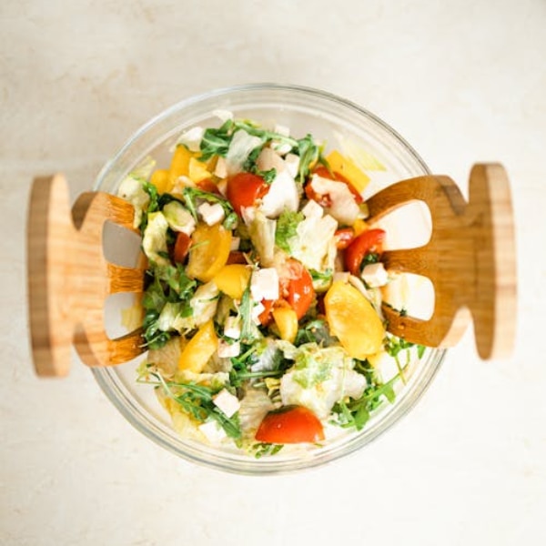 1. In a large mixing bowl, combine the arugula, spinach, bell pepper, cherry tomatoes, cucumber, onion, and chilli.