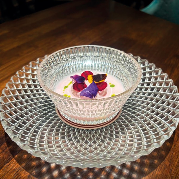 What makes the menu interesting is how those ingredients are reinterpreted. Zucchini flowers are turned into a crisp papdi (cracker) that anchors a chaat-style (street food) bite, while achappam (a flower shaped Kerala cookie) arrives, paired with sharp black lime, adding a bright, unexpected edge. Even classic mango and rhubarb take on new personalities in playful paani Solkadhi puri (another Indian street food favourite) variations. “With each menu, we pick up a theme,” Ahmed explains. “Then we try to incorporate ingredients that belong to that region, but present them in a slightly different way.”
