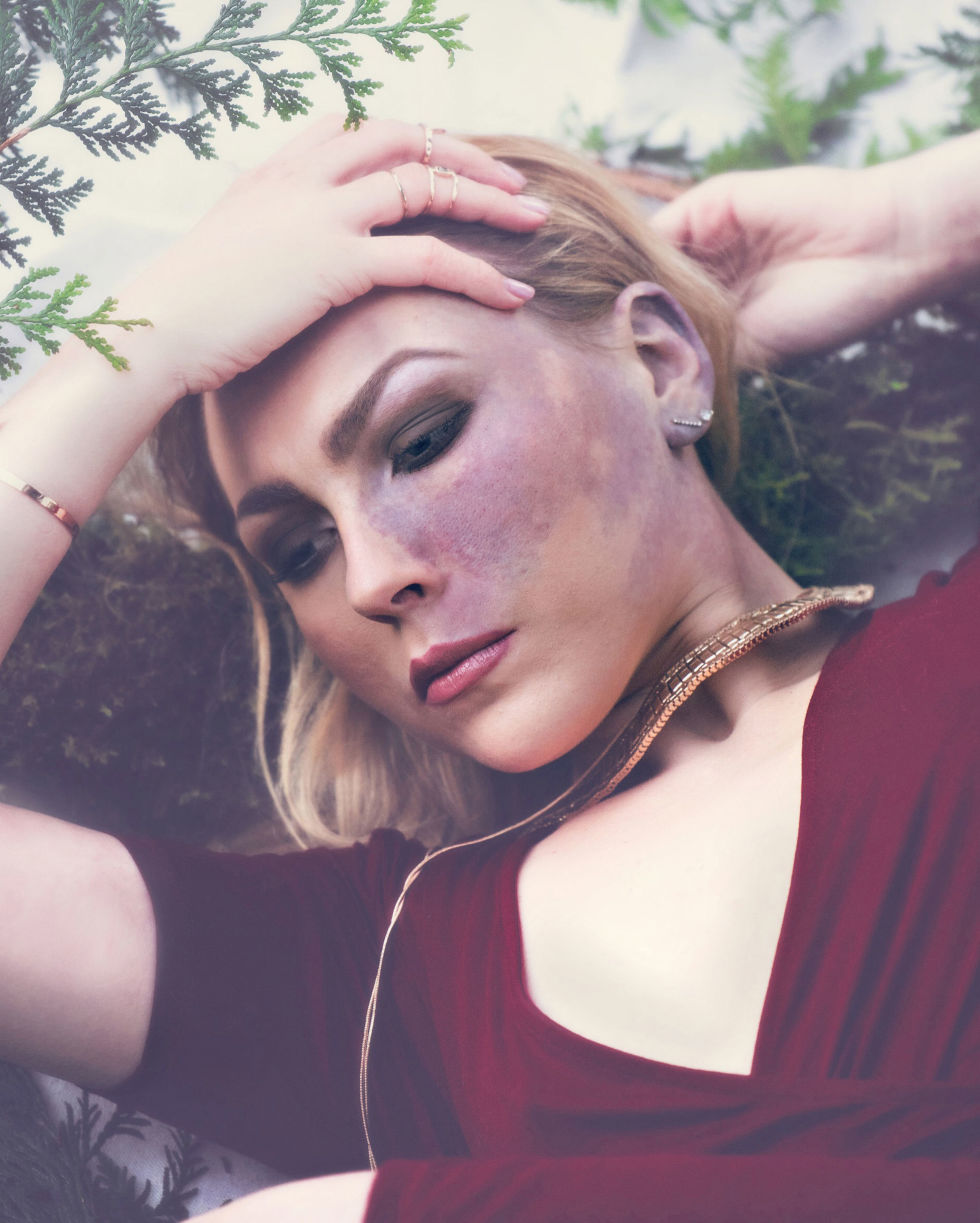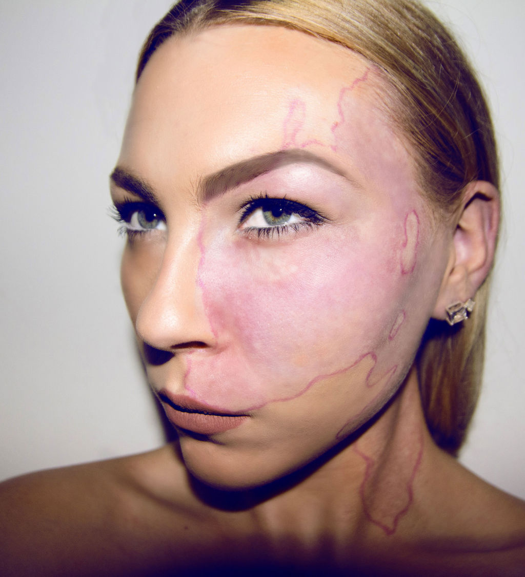 Billiot was born with a prominent red birthmark over her cheek, a feature you might think she would be inclined to cover up, given her line of work. But she recently collaborated with several photographers to highlight her birthmark, which she describes as a "port-wine stain," in a project called Flawless Affect.